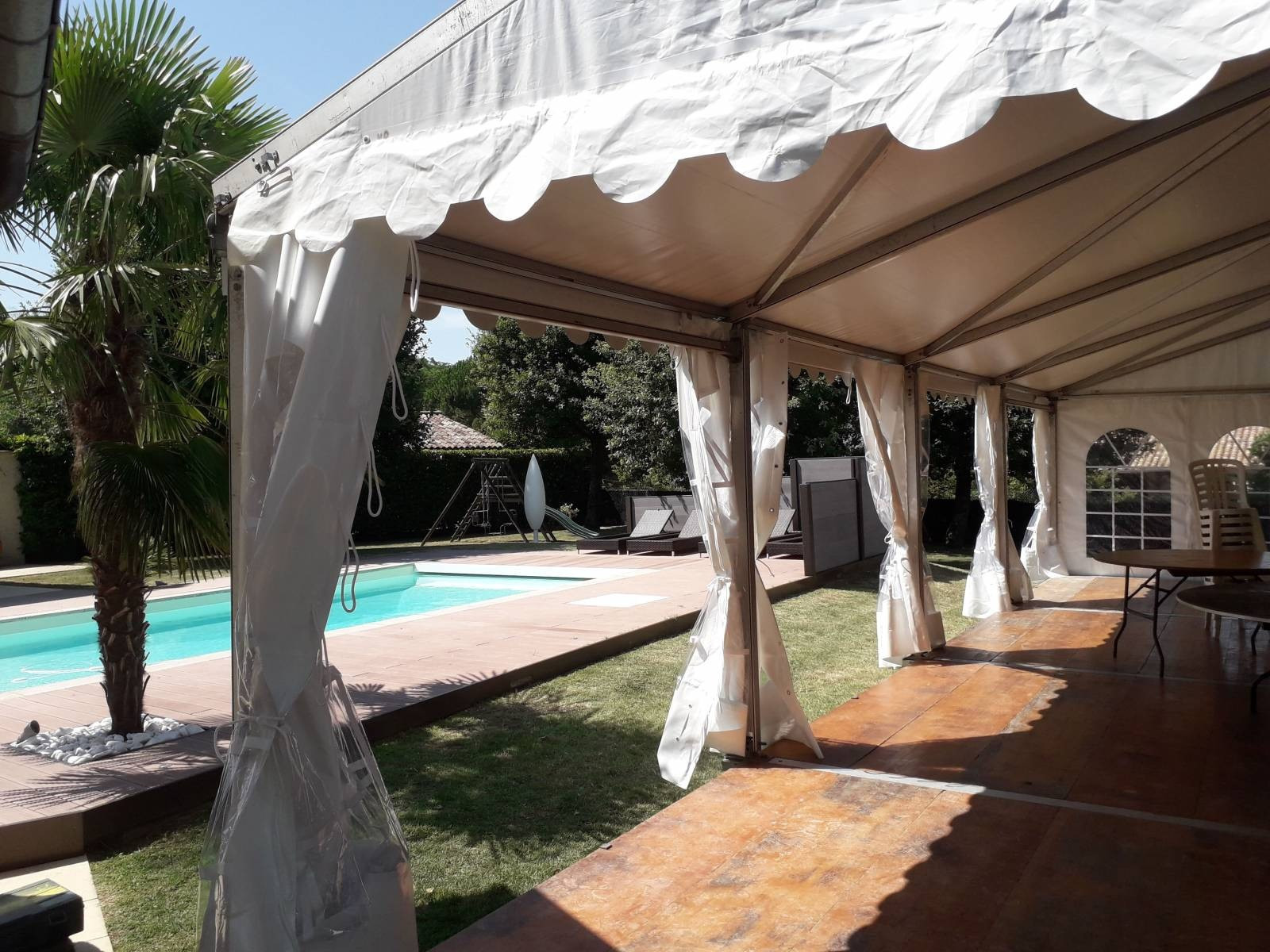 LDC - location de chapiteaux est intervenu chez un particulier en région lyonnaise, afin de monter une tente Multiforme 6x12 avec plancher.