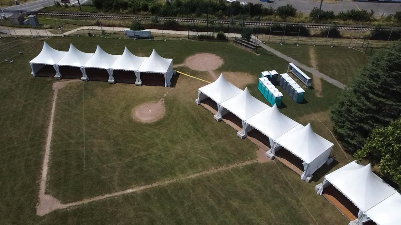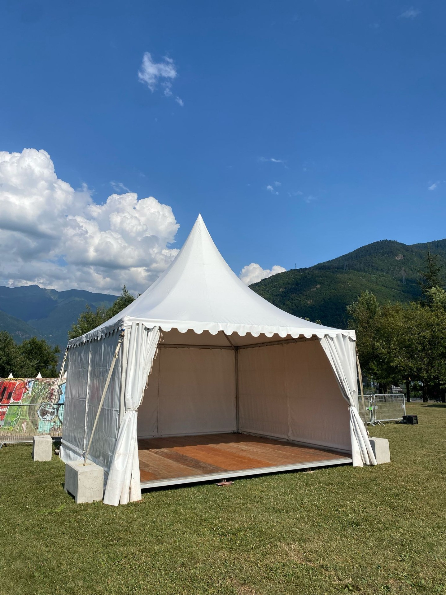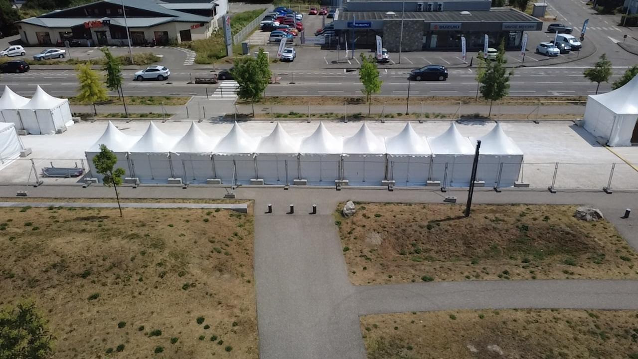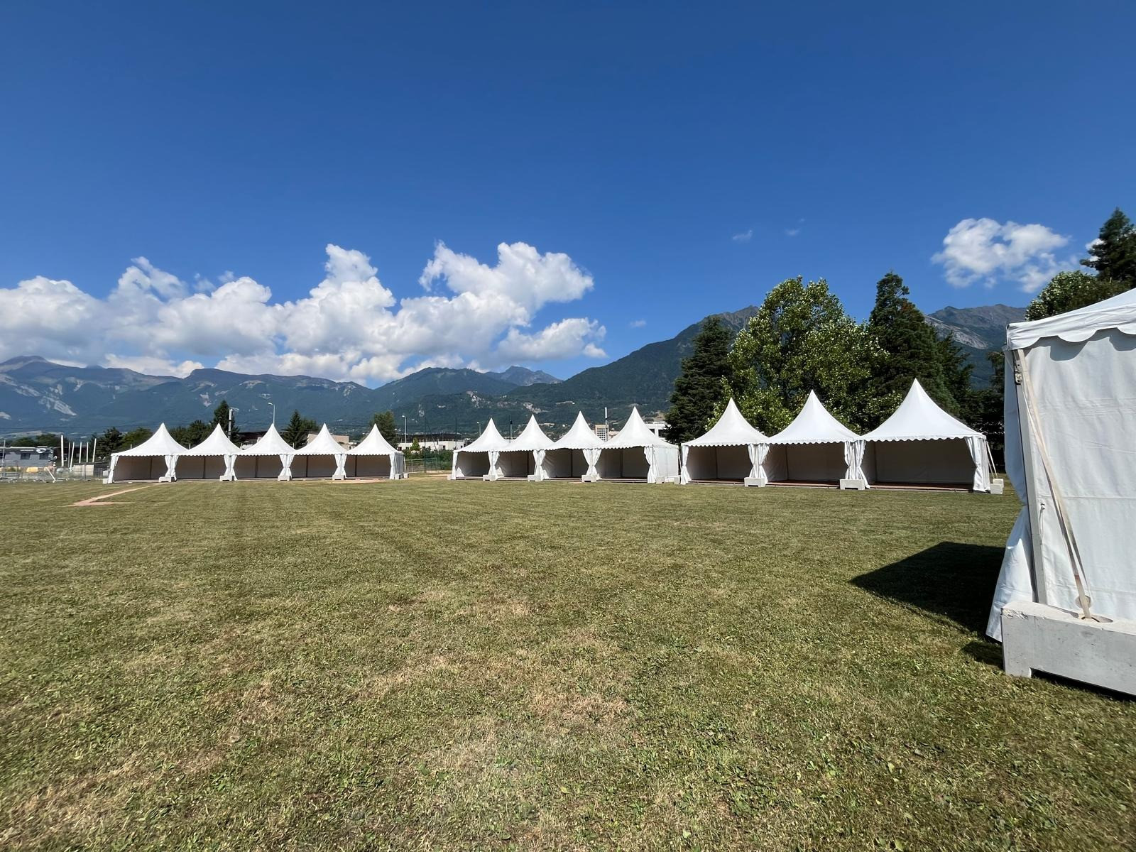 LDC Location de chapiteaux a installé une grande quantité de chapiteaux 5x5 ou garden cottage pour l'Étape du Tour, événement adossé au Tour de France, à Albertville en Savoie.