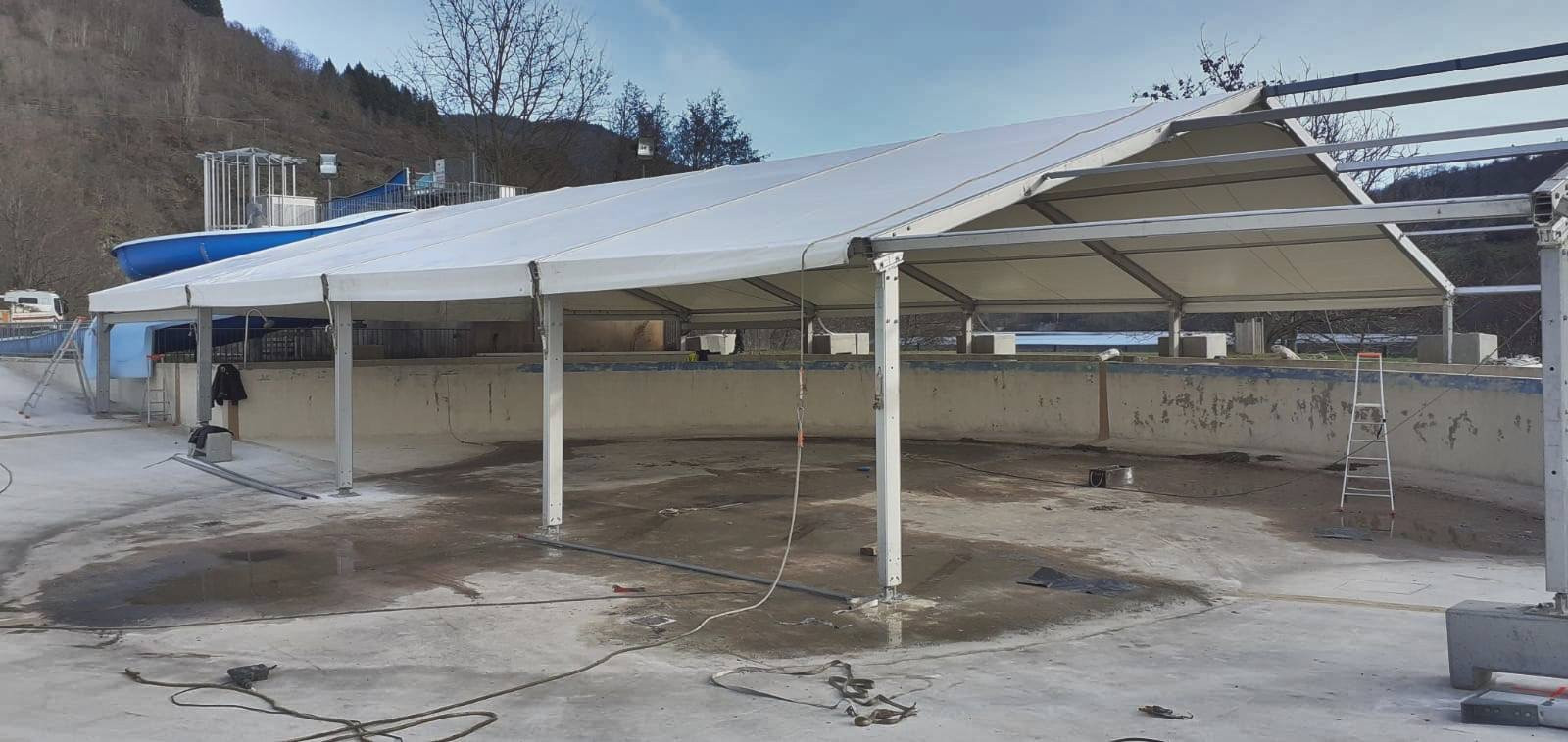 L'équipe technique de LDC location de chapiteaux a réalisé une structure aux pieds de taille modulable afin de s'adapter à tout type de chantier. Grâce à cela, nous avons été en mesure de couvrir une piscine dans le cadre d'une rénovation de bassin avec un chapiteau spécifique de 15 x 30 m.