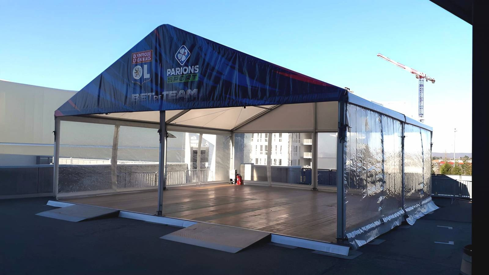 Dans le cadre des matchs de l'Olympique Lyonnais, LDC - location de chapiteaux a monté une structure traditionnelle 10x10m au Groupama stadium de Lyon. Ce chapiteau a été utilisé pour accueillir un sponsor de l'équipe lyonnaise de foot. L'entoilage cristal apporte classe et lumière naturelle.