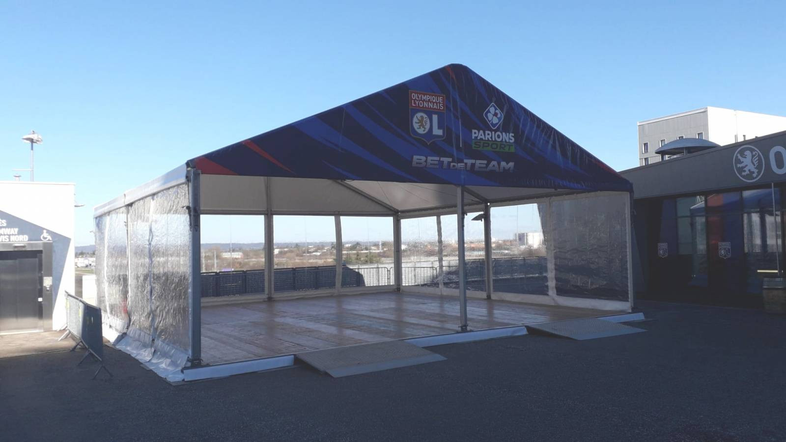 Dans le cadre des matchs de l'Olympique Lyonnais, LDC location de chapiteaux a monté une structure traditionnelle 10x10m au Groupama stadium de Lyon. Cette structure a été utilisée pour accueillir un sponsor de l'équipe lyonnaise. L'entoilage cristal apporte classe et lumière naturelle.