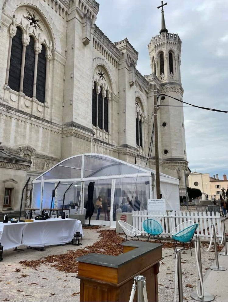 Une agence événementielle a fait appel à LDC - loccation de chapiteaux pour installer une tente traditionnelle arquée de 10m par 5m à la Basilique Fourvière de Lyon pour une soirée au coeur de la région Auvergne Rhône-Alpes.